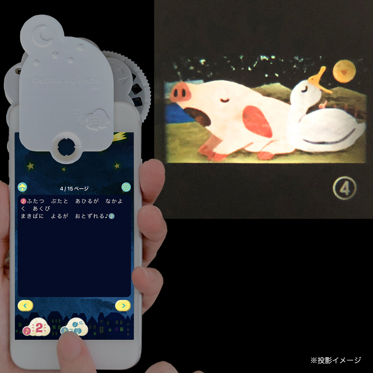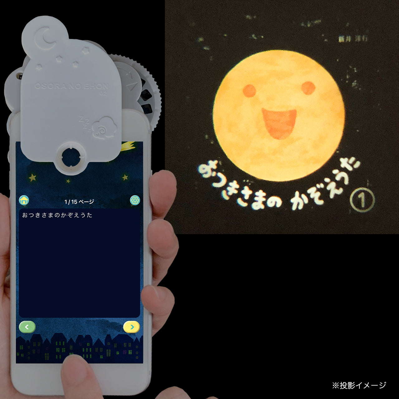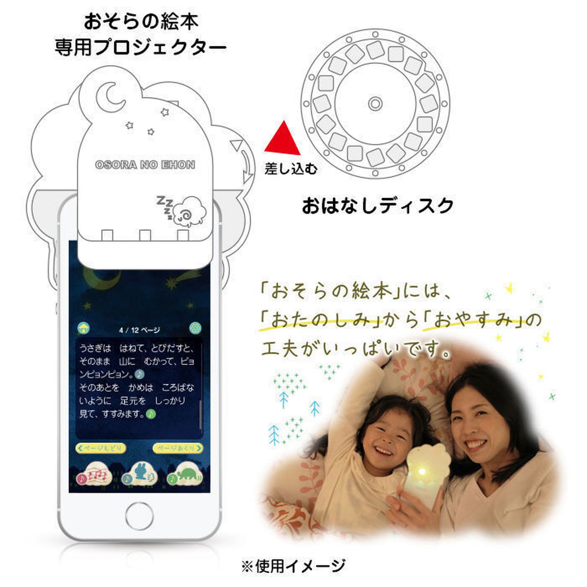 スマートフォンのLEDライトと専用プロジェクターとディスクを使い、無料の専用アプリでお部屋の天井に絵本を映し出すアイテムです。