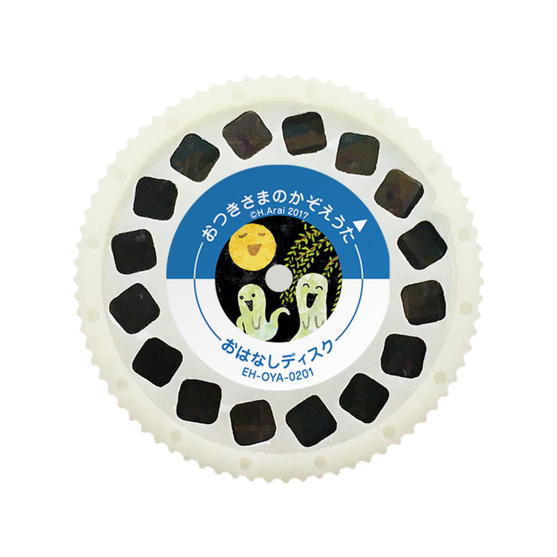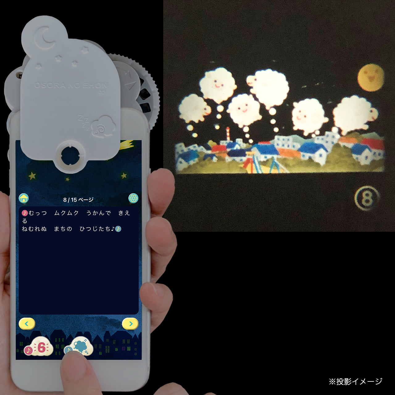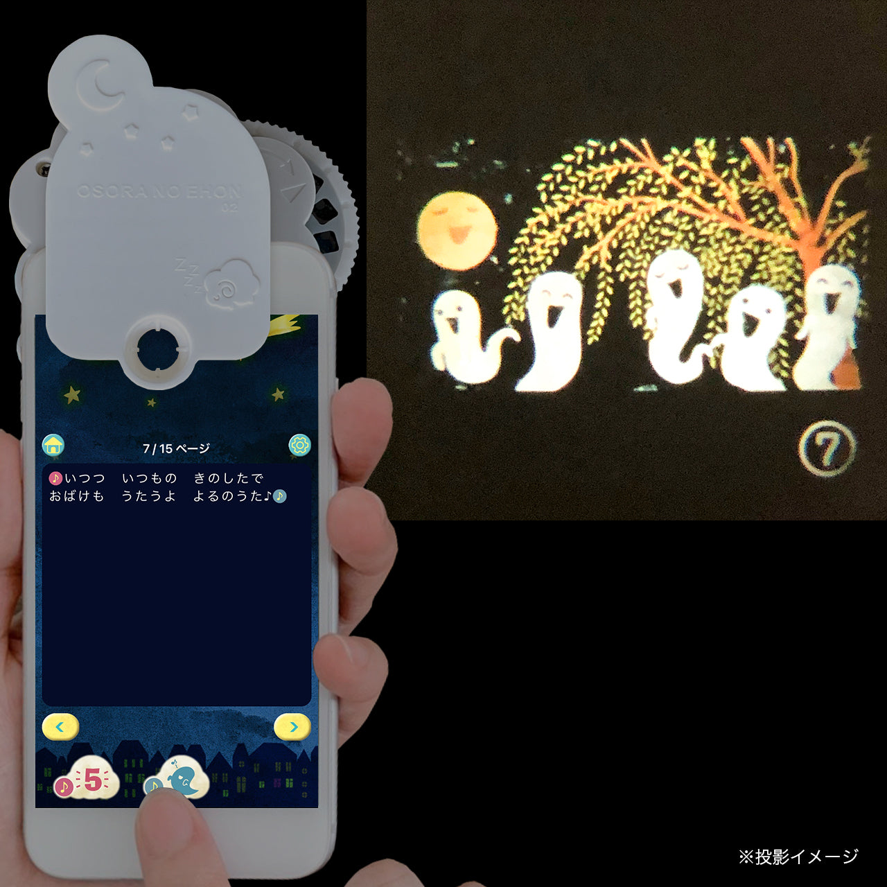 スマートフォンのLEDライトと専用プロジェクターとディスクを使い、無料の専用アプリでお部屋の天井に絵本を映し出すアイテムです。
