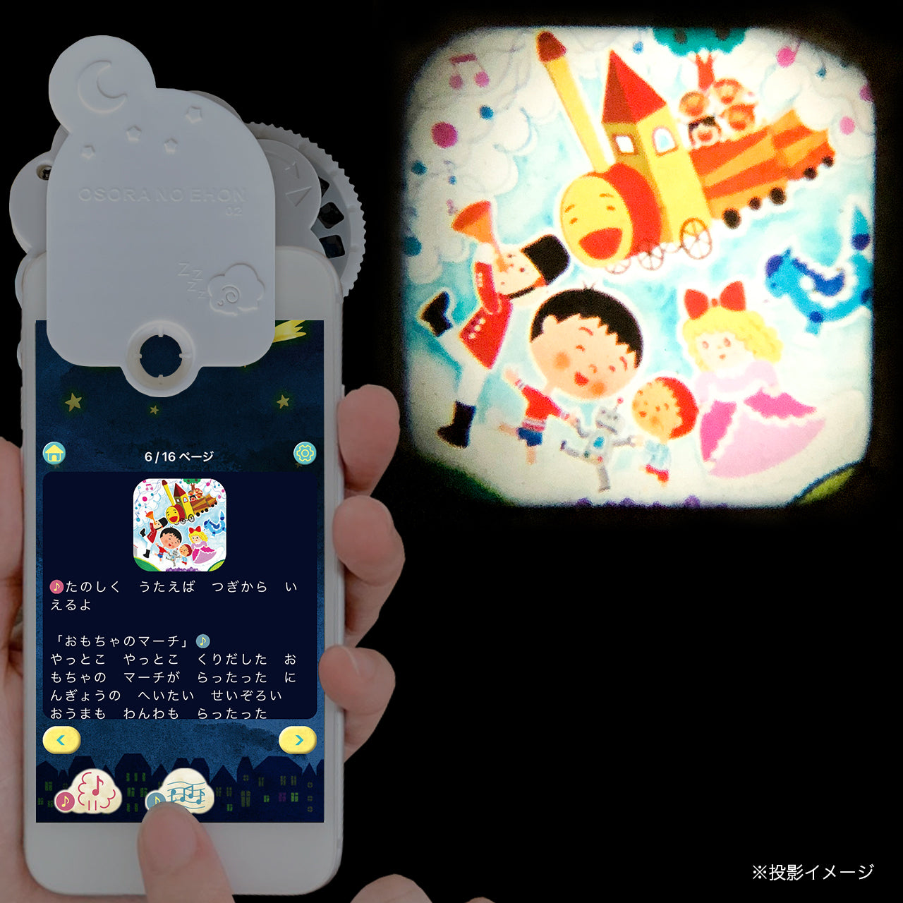 スマートフォンのLEDライトと専用プロジェクターとディスクを使い、無料の専用アプリでお部屋の天井に絵本を映し出すアイテムです。