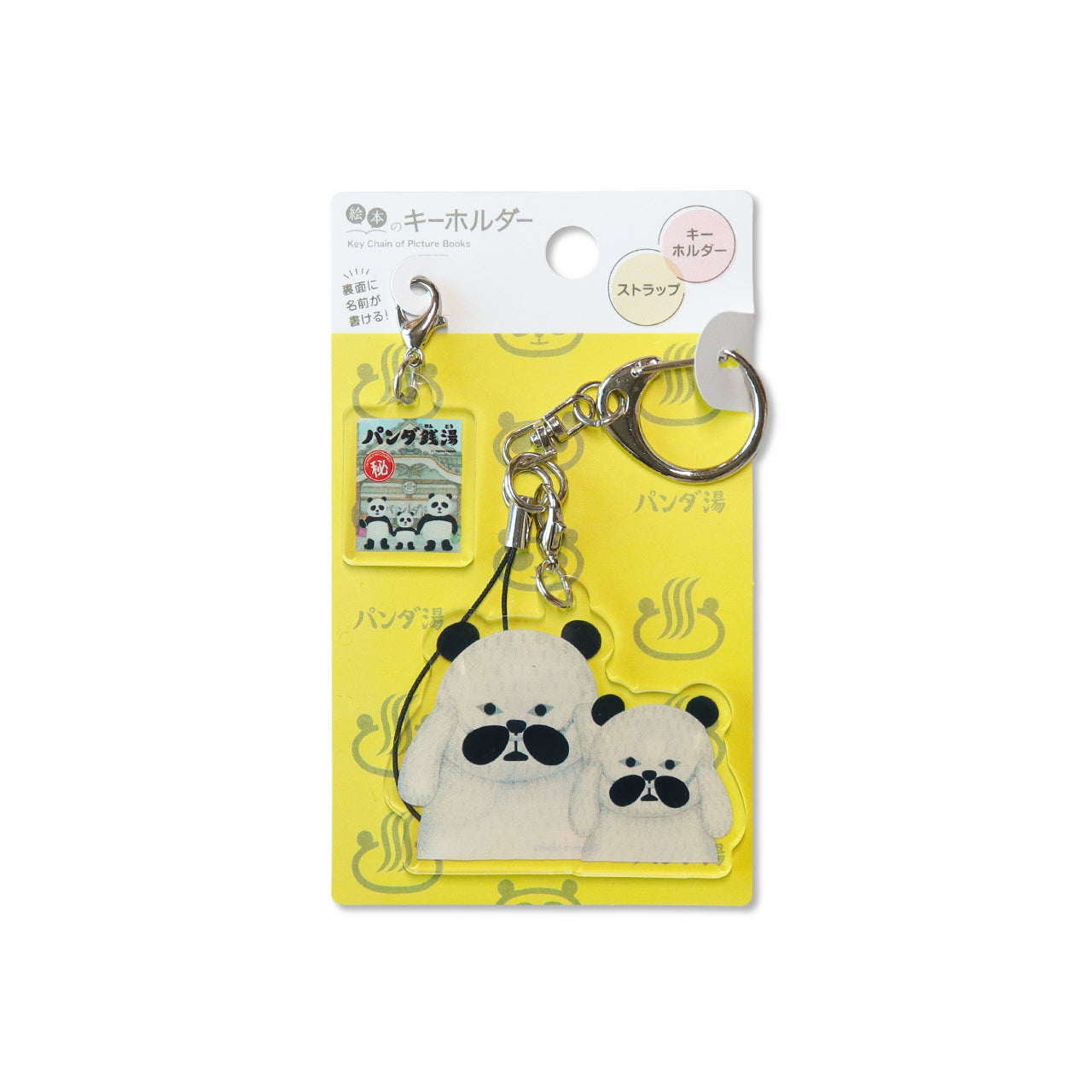人気絵本「パンダ銭湯」の、キャラクターと絵本のアクリルキーホルダーのセットです。