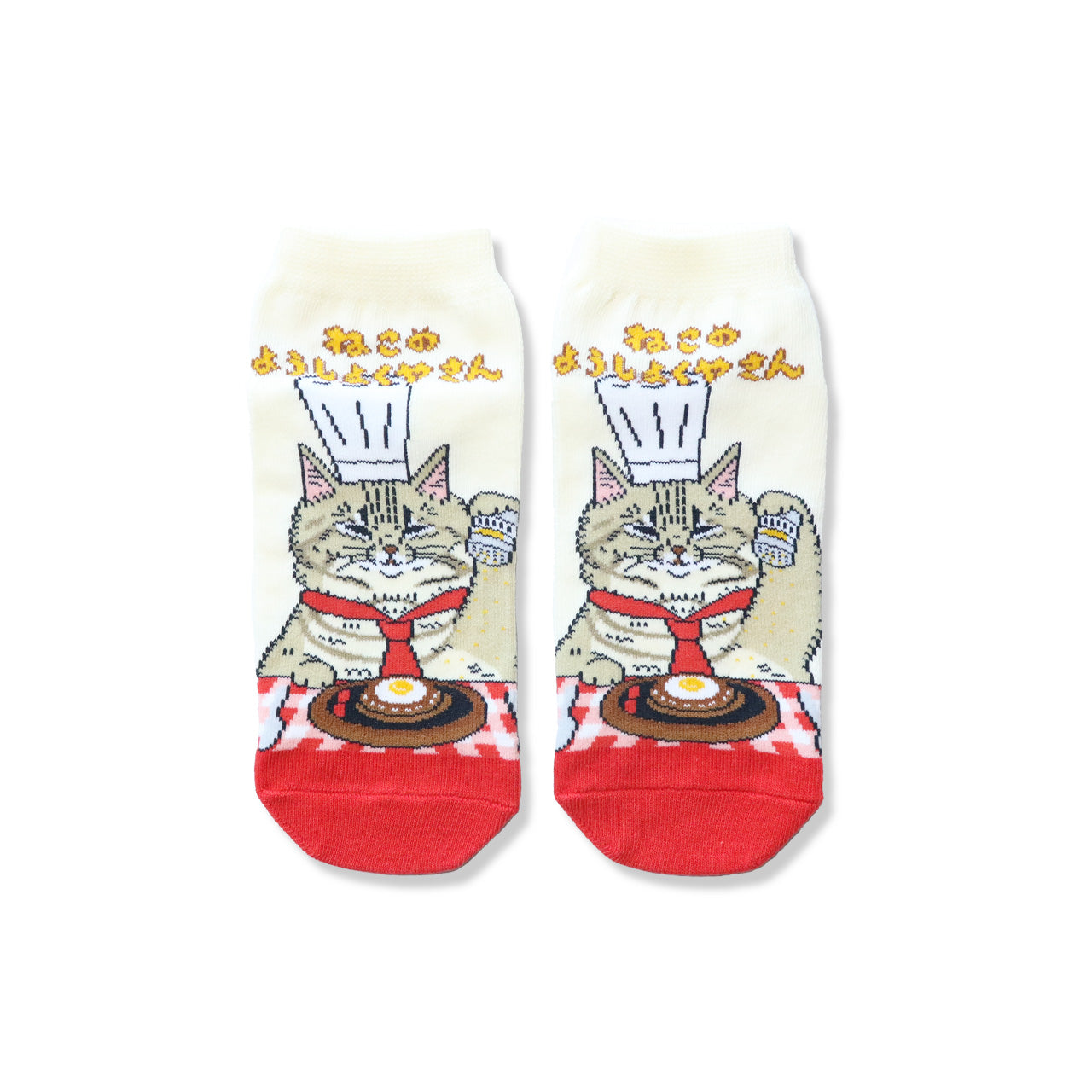 人気の絵本【ねこのようしょくやさん】柄の可愛い靴下です。