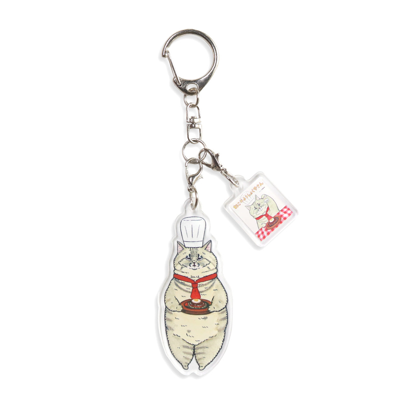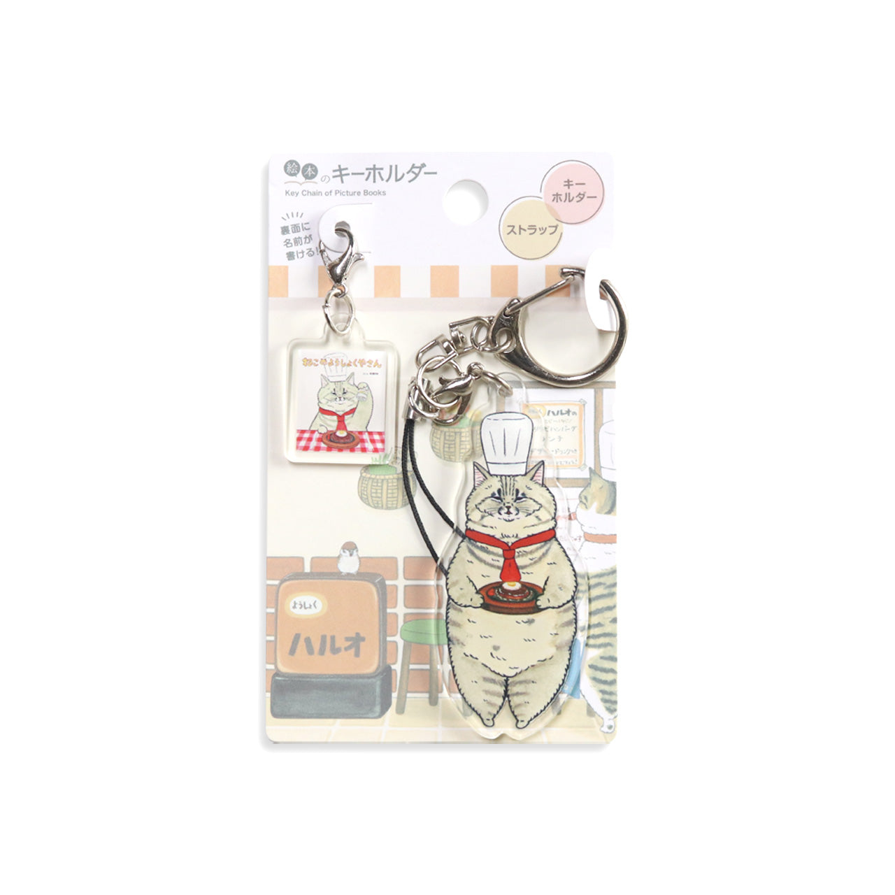 人気絵本「ねこのようしょくやさん」の、キャラクターと絵本のアクリルキーホルダーのセットです。